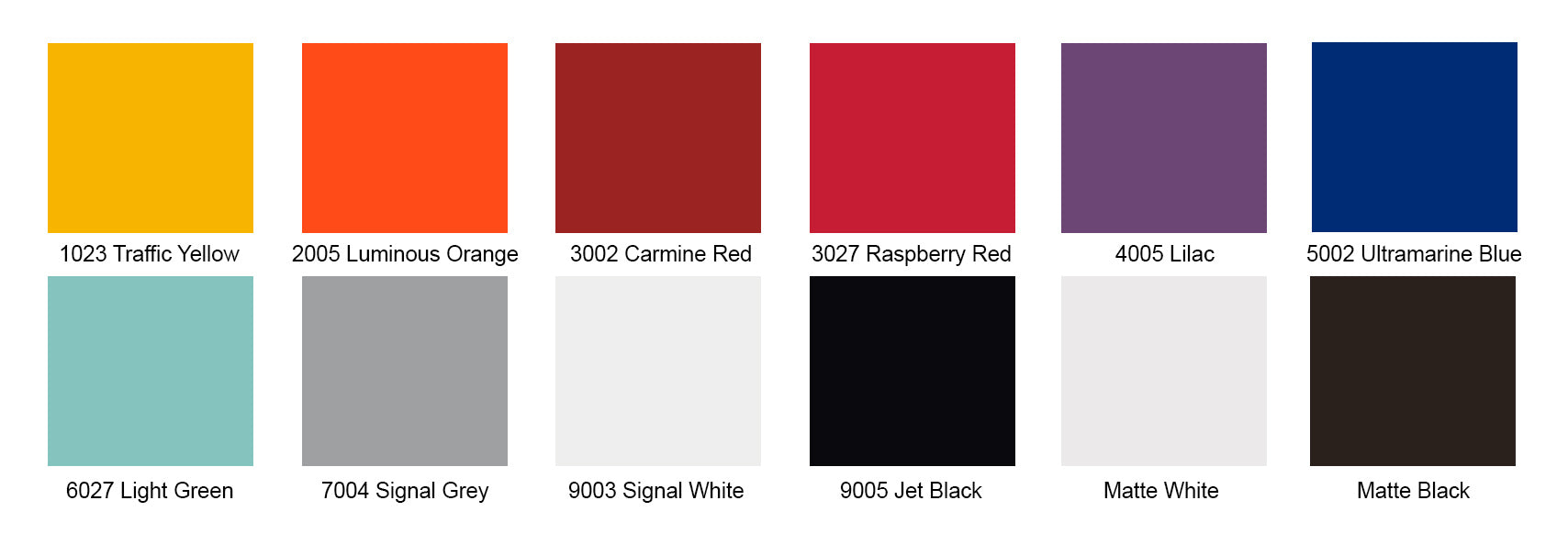 Traffic Yellow, Luminus Orange, Carmine Red, Raspberry Red, Lilac, Ultramarine Blue, Light Green, Signal Grey, Signal White, Jet Black, Matte White, Matte Black