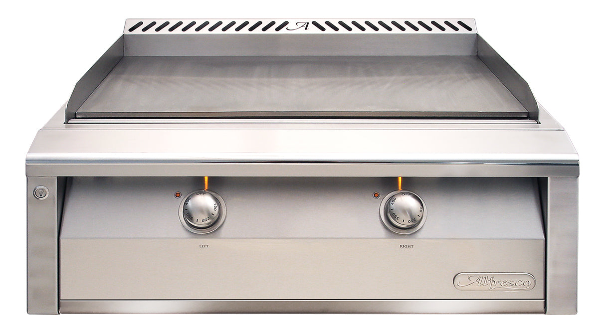 Add a new dimension to your outdoor cooking experience with the Alfresco 30″ professional griddle. Features a Dual-zone thermostatically controlled 3/8” solid steel griddle surface that is designed to create precise even heating over entire cooking area.