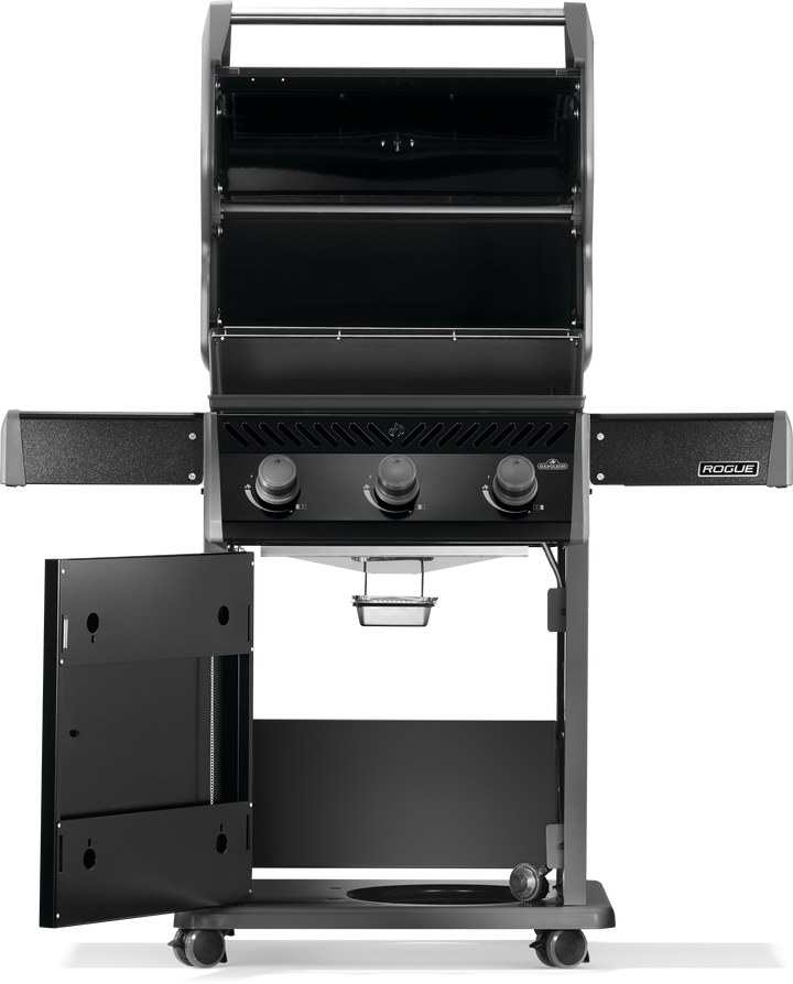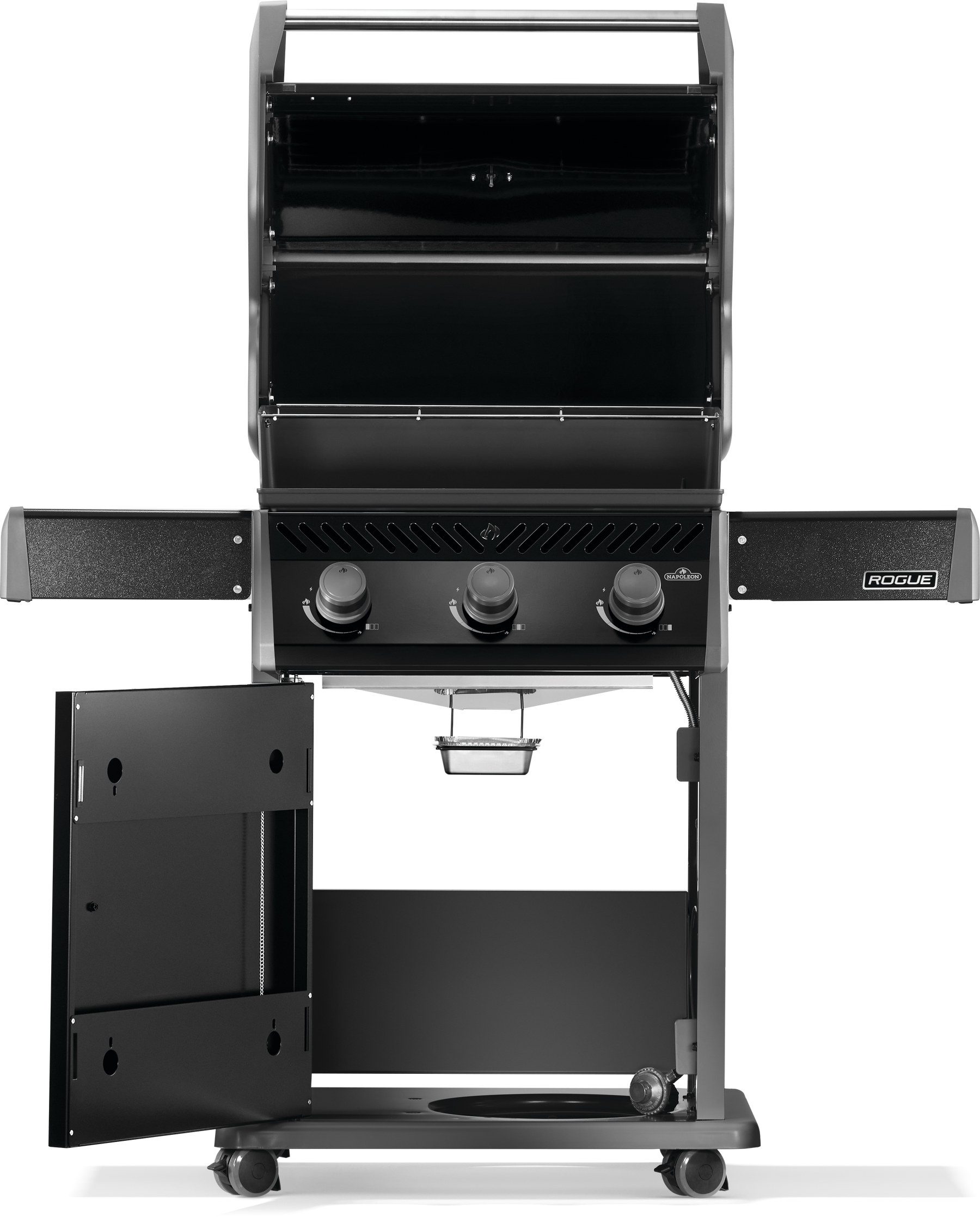 Napoleon’s Rogue® 425 Propane or Natural Gas Grill is a premium, yet affordable BBQ marvel. With three burners that light instantly and effortless temperature control, it ensures perfect grilling or roasting. Its stainless steel cooking grids deliver even heating and require next to no maintenance, while the stainless steel sear plates help reduce flareups. Durable black porcelain enamel and powder-coated surfaces resist weather and fingerprints. Foldable side shelves enhance storage versatility. Ignite instantly with battery-free ignition. Move effortlessly with Locking Caster Wheels. Enjoy exceptional grilling in any space.