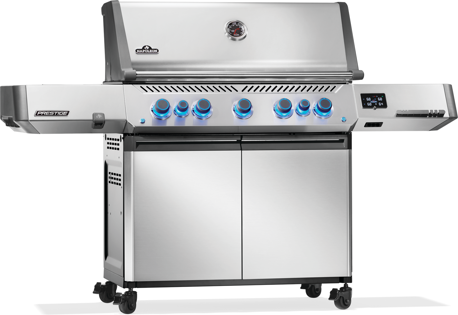The stainless steel Prestige 665 Connected, Propane Gas Grill with Infrared Side and Rear Burner is a dynamic evolution in grilling, featuring Wi-Fi and Bluetooth connectivity that brings you closer to your grilling experience than ever before. Monitor temperatures, set timers, get cook assistance, and receive high-temperature warnings—all from your smartphone. With included temperature probes and an integrated LCD display, you'll always know exactly what's happening inside your grill. A larger rotisserie burner and infrared sear station, side burner provide enhanced performance. LED Control Knobs illuminate for nighttime entertaining and feature SafetyGlow™, glowing red for added safety when the gas is on. The stow-away warming rack keeps things tidy, and hidden tool hooks provide extra prep space. Enjoy new ways to experience connected living and unique cooking methods with the compelling Prestige 665 Connected Gas Grill.