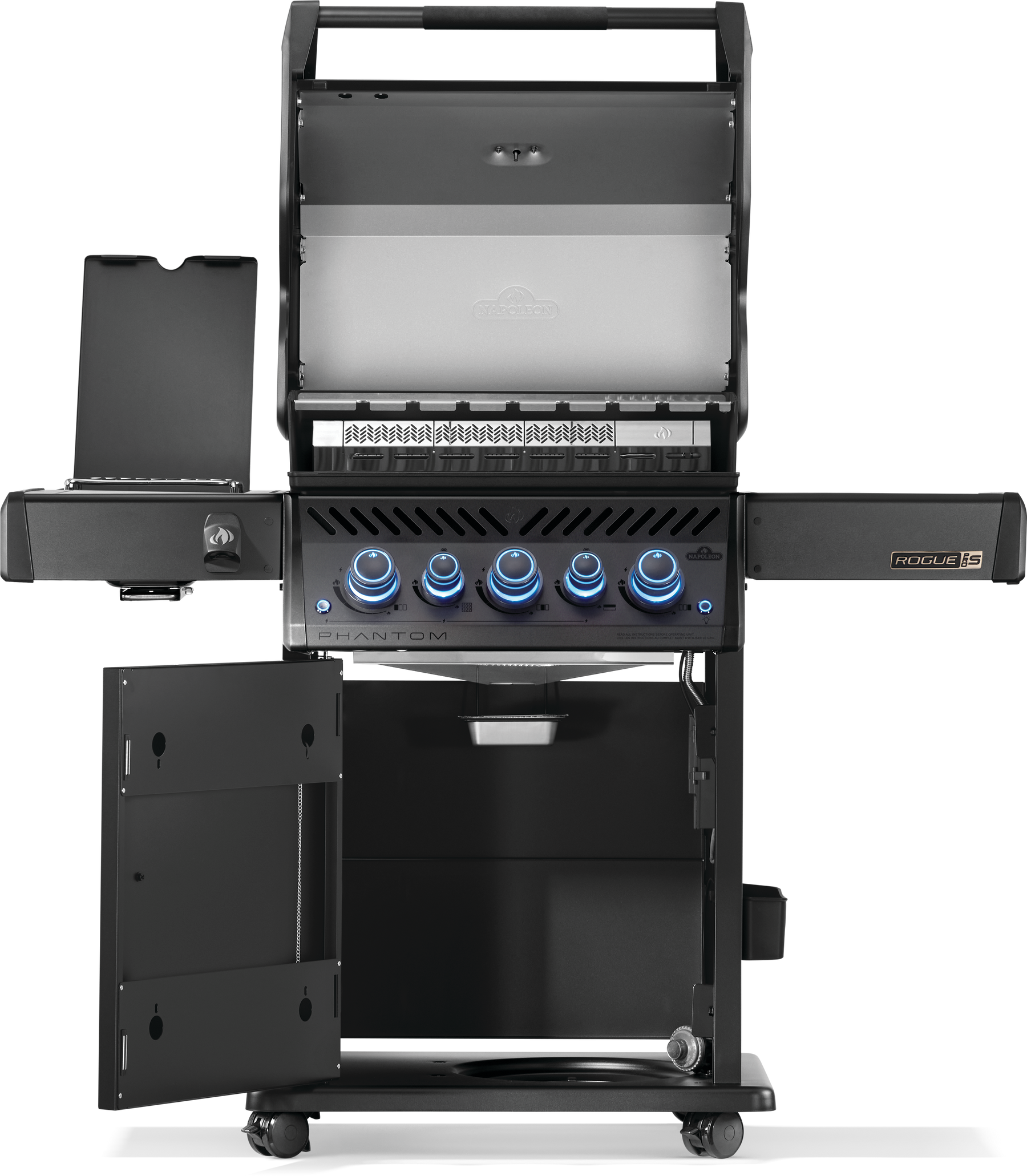 The Phantom Rogue® PRO-S 425 Grill in Propane Gas, boasts a luxurious, matte black finish that exudes elegance. Crafted with premium features, this grill seamlessly combines sophistication and luxury. Its rear infrared rotisserie burner guarantees succulent roast meals, while the infrared sear station, side burner delivers restaurant-quality sides and sauces or sears meat to perfection. The iconic WAVE™ shaped cooking grids ensure even heating, while dual-level stainless steel sear plates vaporize drippings, keeping your barbecue pristine. With ergonomic control knobs for easy and safe operation and a battery-free starter for instant ignition, this grill is designed for effortless performance. A convenient space-saving folding side shelf and easy-locking casters enhance versatility. Elevate your outdoor grilling experience with this premium BBQ, offering superior quality and style.
