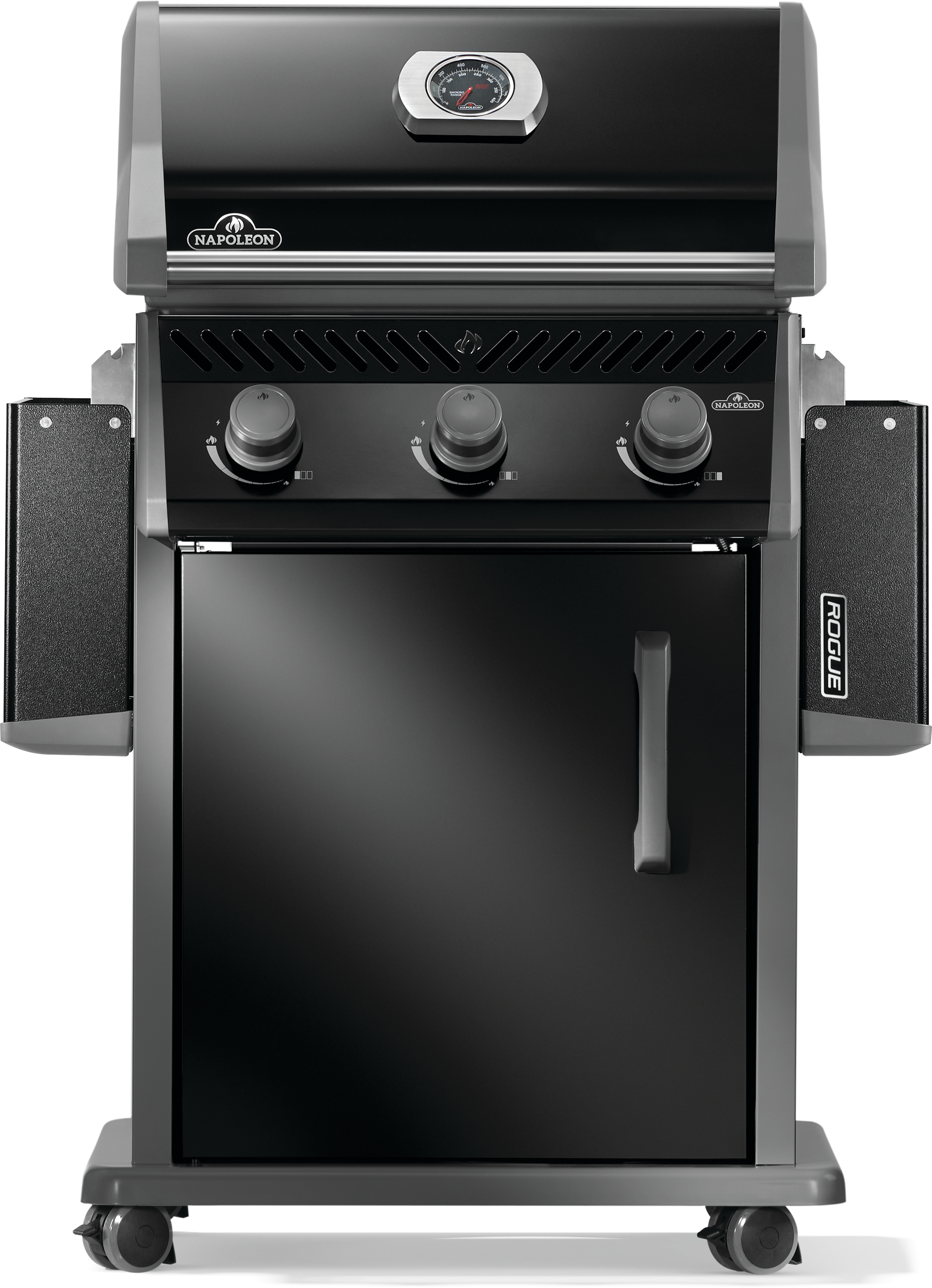Napoleon’s Rogue® 425 Propane or Natural Gas Grill is a premium, yet affordable BBQ marvel. With three burners that light instantly and effortless temperature control, it ensures perfect grilling or roasting. Its stainless steel cooking grids deliver even heating and require next to no maintenance, while the stainless steel sear plates help reduce flareups. Durable black porcelain enamel and powder-coated surfaces resist weather and fingerprints. Foldable side shelves enhance storage versatility. Ignite instantly with battery-free ignition. Move effortlessly with Locking Caster Wheels. Enjoy exceptional grilling in any space.