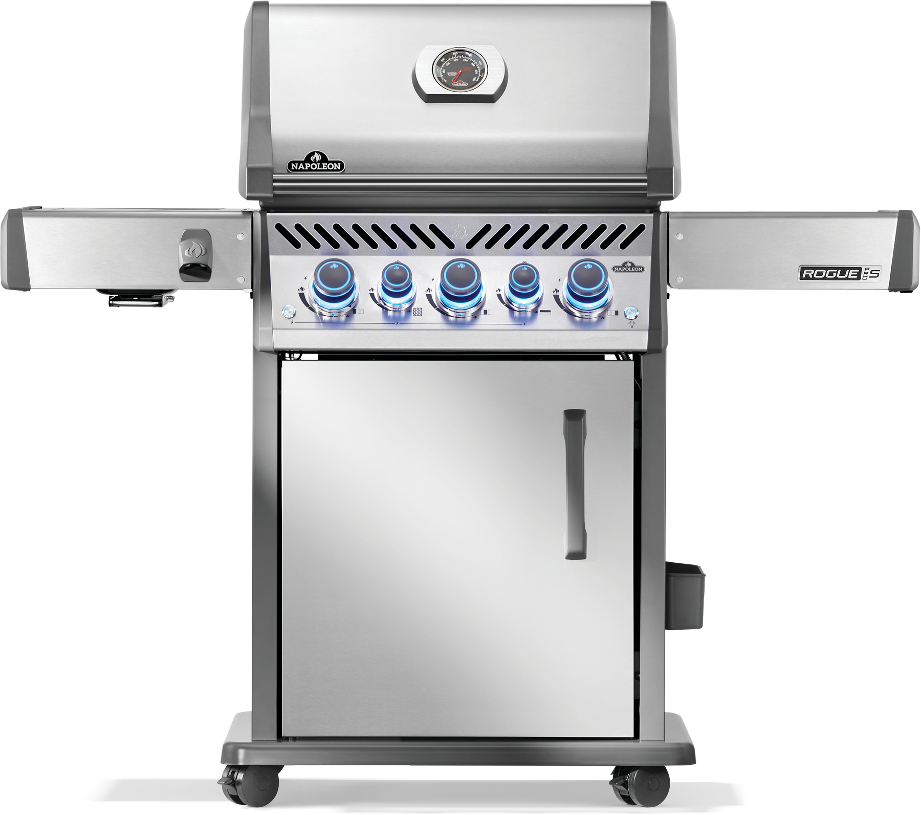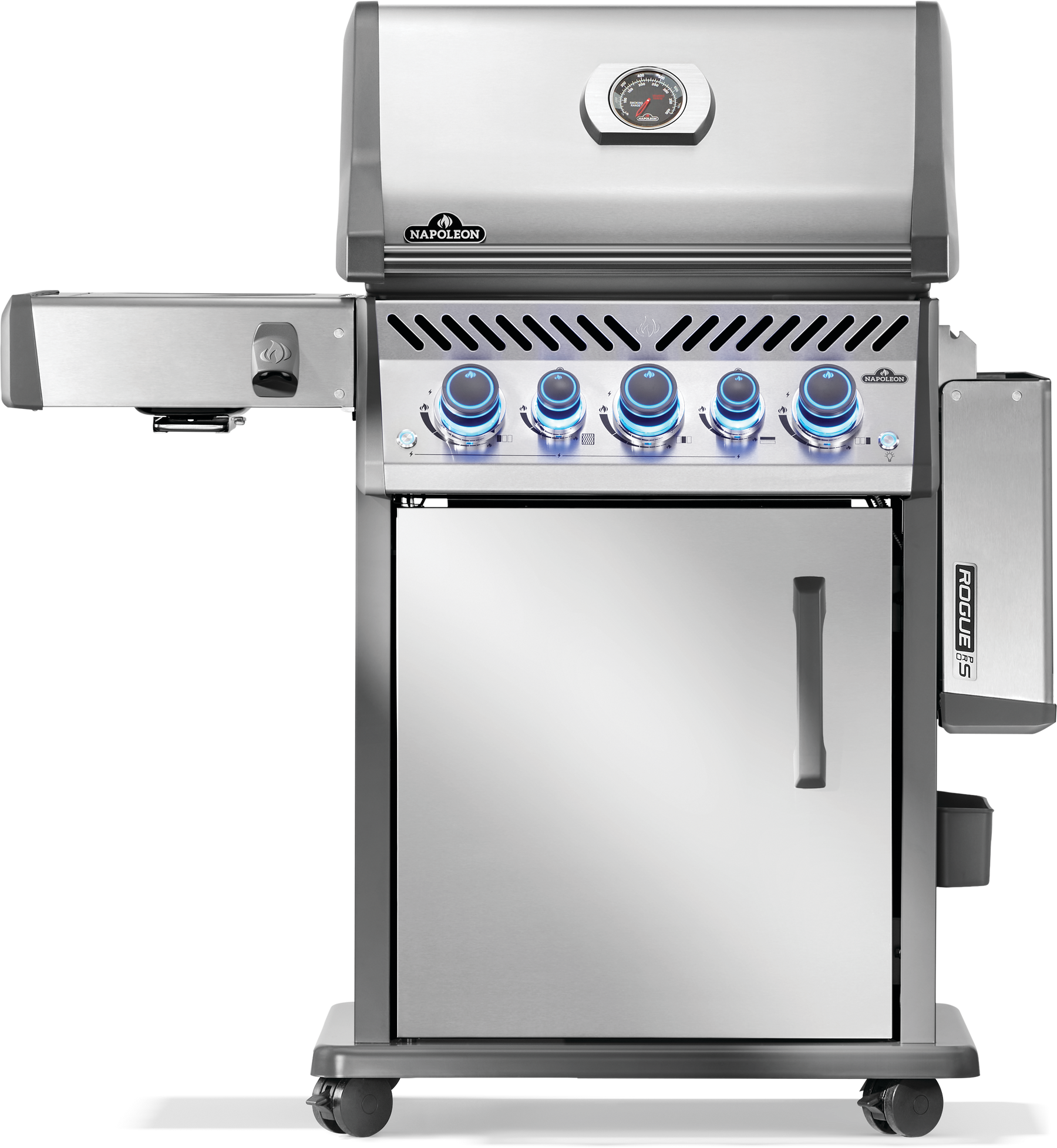 When premium features combine with excellence; you get the Rogue® PRO-S 425 Stainless Steel Grill in Propane or Natural Gas. Experience succulent roast meals with the rear infrared rotisserie burner, while the large infrared sear station, side burner delivers restaurant-quality sauces, sides, or sears meat perfectly. The iconic WAVE™ shaped cooking grids ensure even heating and prevent food from falling through while dual-level stainless steel sear plates keep your grill pristine by vaporizing drippings. The ergonomic control knobs feature SaftyGlow™, illuminating red when a burner is in use, making operation safe and effortless. A convenient, space-saving folding side shelf and easy-locking casters ensure convenience. The durable and stunning stainless steel construction is easy to maintain and withstands all environments. Elevate your outdoor grilling with superior quality and style. Welcome the ultimate grilling experience with the Rogue® PRO-S grill.