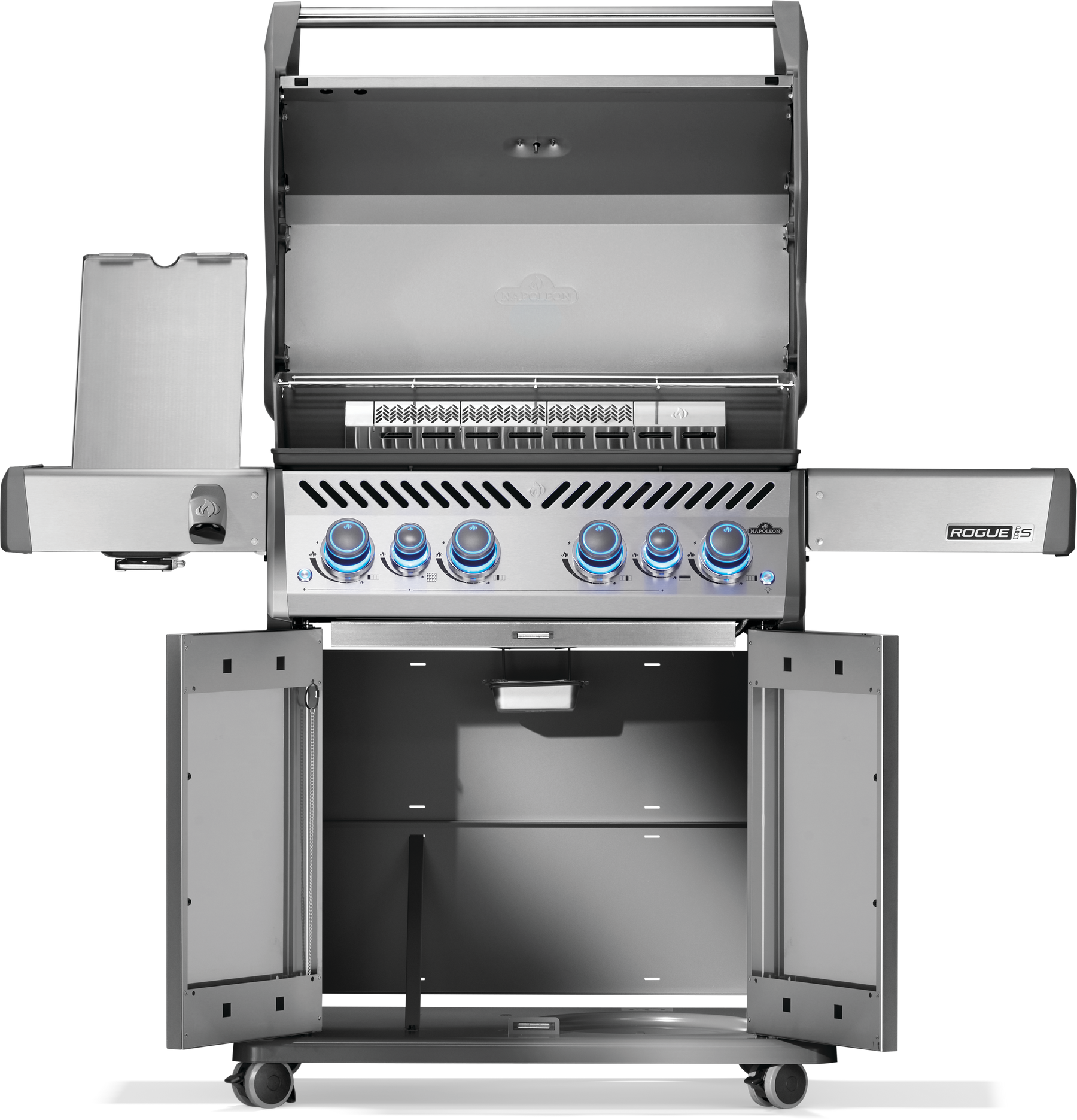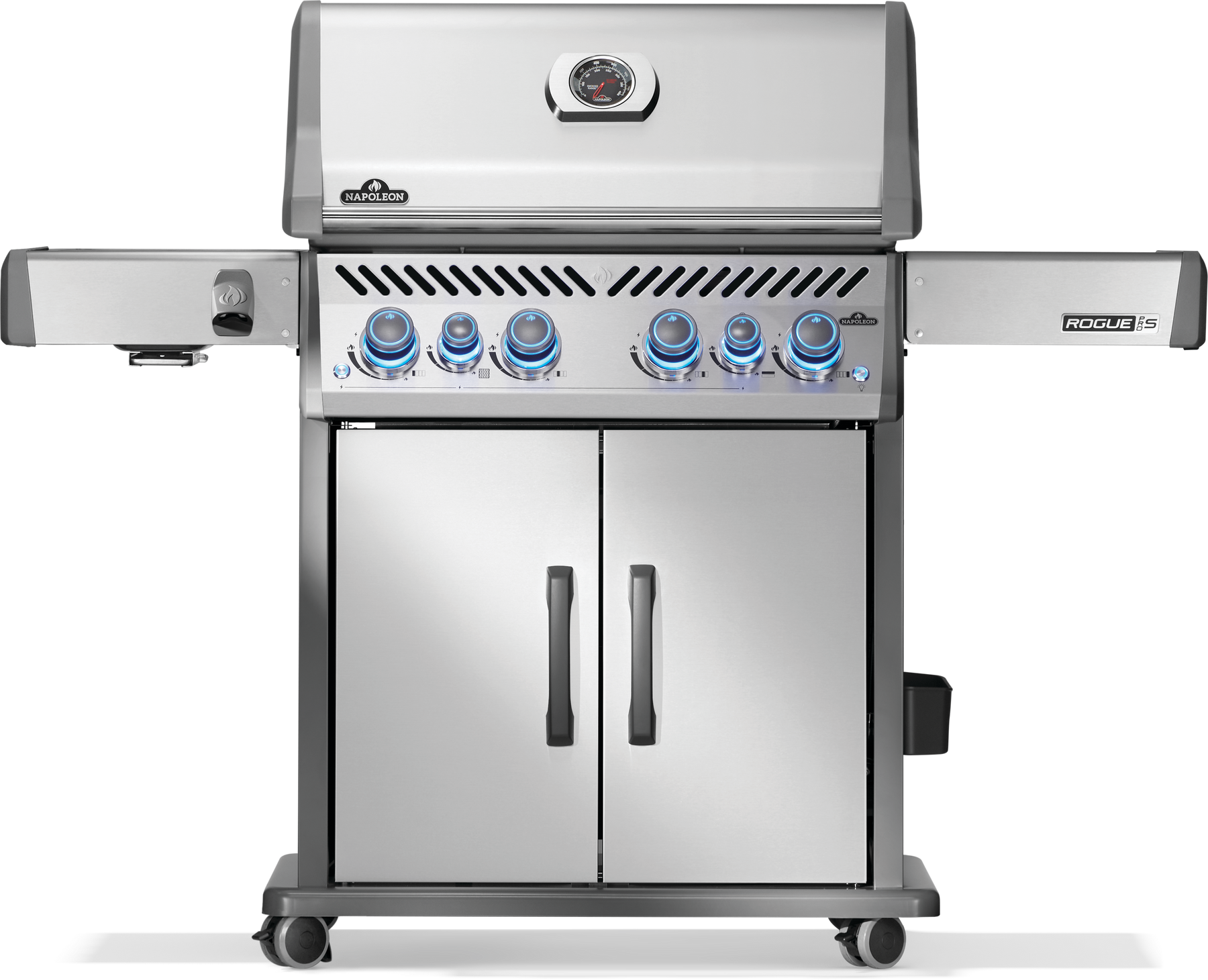 When premium features combine with excellence; you get the Rogue® PRO-S 525 Stainless Steel Grill in Propane Gas. Experience succulent roast meals with the rear infrared rotisserie burner, while the large infrared sear station, side burner delivers restaurant-quality sauces, sides, or sears meat perfectly. The iconic WAVE™ shaped cooking grids ensure even heating and prevent food from falling through while dual-level stainless steel sear plates keep your grill pristine by vaporizing drippings. The ergonomic control knobs feature SaftyGlow™, illuminating red when a burner is in use, making operation safe and effortless. A convenient, space-saving folding side shelf and easy-locking casters ensure convenience. The durable and stunning stainless steel construction is easy to maintain and withstands all environments. Elevate your outdoor grilling with superior quality and style. Welcome the ultimate grilling experience with the Rogue® PRO-S grill.